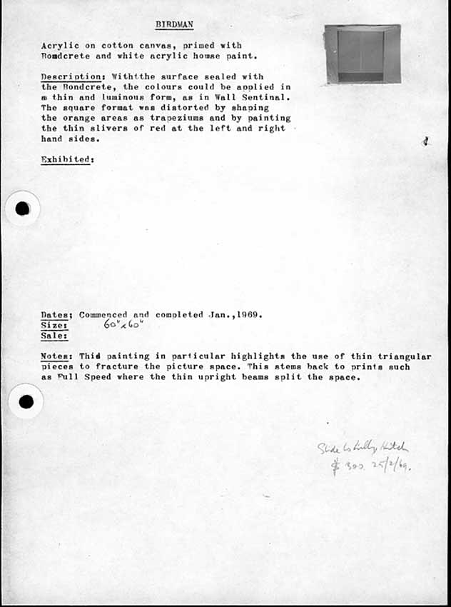 This Note is the original sheet detailing the work Birdman 1969