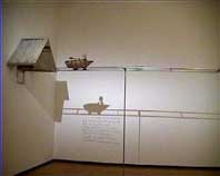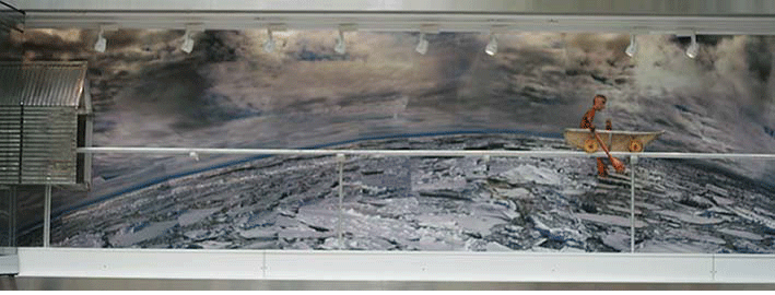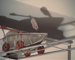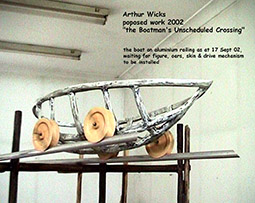 The work consists of a small boat (dimensions 67cm length, 30cm width & 16cm depth) with wheels attached. This boat moves along an aluminium track which projects out from the wall at a height of 2.5 to 3 metres ie. above the heads of the viewers to a length of about 4.5metres.  A small cutout figure in the boat appears to be rowing the boat as its arms & body move backwards & forwards with the boat’s movement. ......