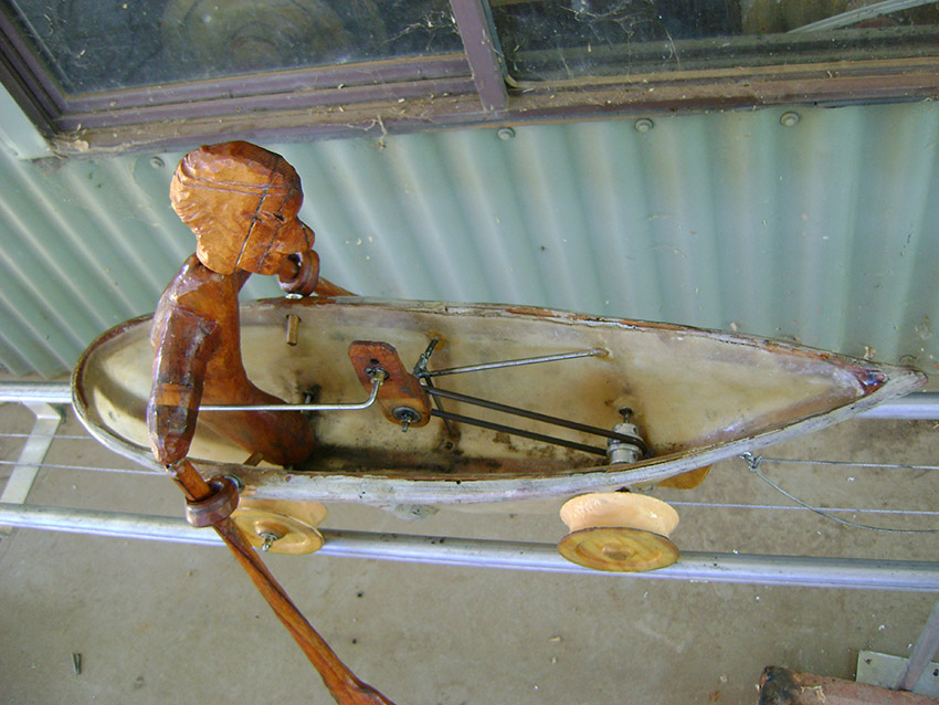 The interior boat belt is anchored to the wheel axle and then to an off centre wheel that creats a rotation that drives the boatman back and forth in a jerky rowing motion..