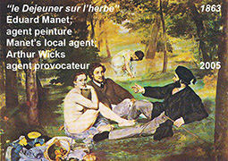 This particular event for the Strand Ephemera was called l Unch on the Grass; a direct reference to Manet's Dejeuner sur l'herbe painting. For this event I was dressed in my suit and latex mask with pre-recorded tape issuing trivial conversation through a microphone on the lapel. At the same time I was distributing business cards announcing myself as his local agent. The event lasted an hour.