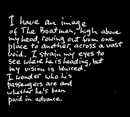 The Boatman in Townsville Queensland was a compound event.. Initially it was involved in the Strand ephemera exhibition; the Strand being a pedestrian dedicated strip along the oceanfront. This resulted in the Boatman being installed in a restaurant at the northern point of the Strand; windows on the eastern side of the building giving a panoramic view of the ocean and Magnetic Island in the distance. This took place in September 2005.