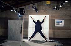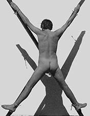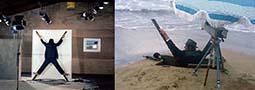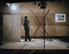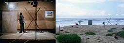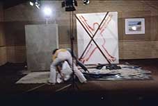 Against the Tide was devised as a performance using an interior space as a foil to the exterior performance of Measuring Stick. After the performer, Arthur Wicks, has identified his space/territory, he positions himself onto a wooden "X" from which point a series of actions are carried out on his body. This parallels what is happening in the tidal zone on the other screen.