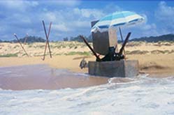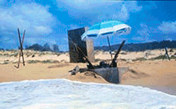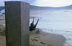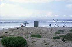 Measuring Stick involved the use of a fibreglass sleeve inserted into the sand just below the high tide level. This sleeve became the resting place for the performer, Arthur Wicks, who was strapped to a wooden "X" structure and lowered into the sand exactly at the low tide point. There he waited for the incoming tide to reach him. This took some six hours, the duration of the performance work.