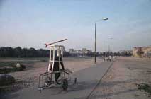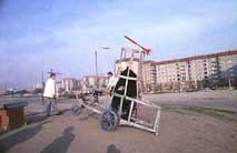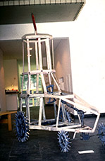 This sculptural vehicle began its life in the performance "the Battlefield" in the Assembly Hall of ADFA, Canberra in 1990 just six months before the start of the first Gulf War. At this stage the vehicle's manoeuvrability was still being road tested, so assistance to guide the vehicle was needed.