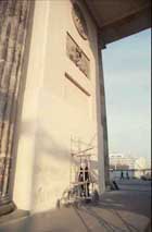 approaching the Brandenberg Tor, the Brandenberg Gate, 1990 The Brandenberg Gate was being cleaned & repaired by an East German company. I needed permission to enter the zone - for myself & one other - the photographer.