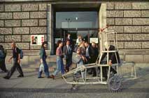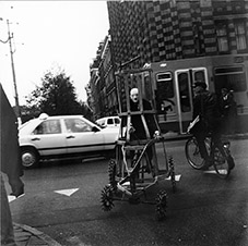 the performance crossing Vizelstraat and return to Fodor Museum, central Amsterdam, 1990