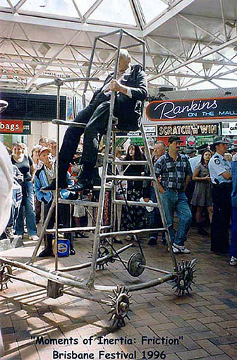 Wicks locates this crisis of power and authority in the 'masculine'. Moments of Inertia: Friction was performed in the Queen Street Mall in the city centre for four days. At the first performance police stopped the work on the grounds that it was dangerous. Rather than simply ceasing the performance, Wicks crawled to his vehicle with the infernal machine strapped to his back, escorted by police the whole way. This inspired collaboration with the police was a spontaneous transference of the masculine anxiety and authority crisis which was the stuff of the performance.