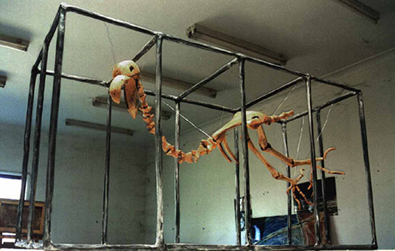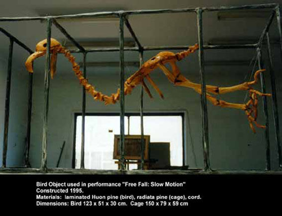 Free Fall: Slow Motion was originally constructed for use in the performance work of the same name for the survey show “25 Years of Performance Art in Australia”, 1994 at the Ivan Dougherty Gallery and the Performance Space, Sydney.  The bird skeletal structure was derived from an illustration of the skeleton of an eagle in Rev J.C. Wood’s Illustrated Natural History, 1869, page 4. The bird sections are articulated by using springs as attachment devices.  As the cage is moved the bird vibrates in response.  This was an important element in the original performance.